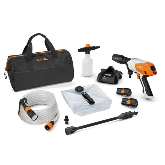 Два акумулятори AS 2, зарядний пристрій AL 1, насадка 4-в-1, подовжувач для насадки, шланг, складна ємність для води, пінна насадка, сумка для зберігання, інструкція, гарантійний талон.